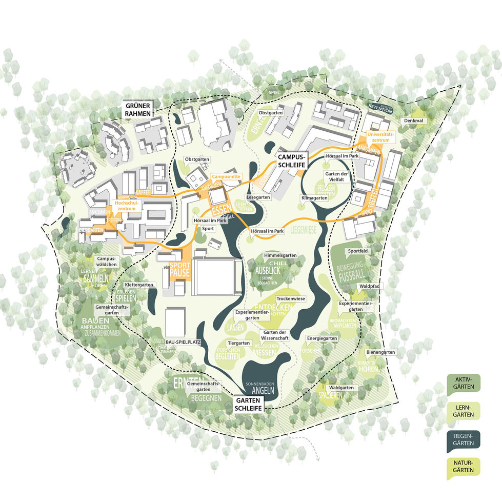 Projektaufgabe: Entwicklung eines städtebaulichen Rahmenplans, der die nutzungsstrukturelle, städtebauliche, verkehrliche sowie freiraumbezogene Ordnung und Entwicklung des Universitäts- und Hochschulcampus aufzeigt und allen Beteiligten als übergeordneter Orientierungsrahmen für den weiteren Austausch und die verbindliche Bauleitplanung dient. Das Werkstattverfahren zur Erstellung des Rahmenplans wurde iterativ aufgebaut. Gewonnene Erkenntnisse konnten stetig in den laufenden Planungsprozess eingespeist werden.
