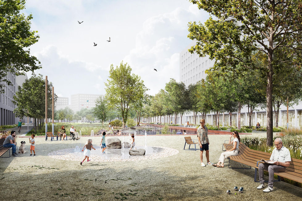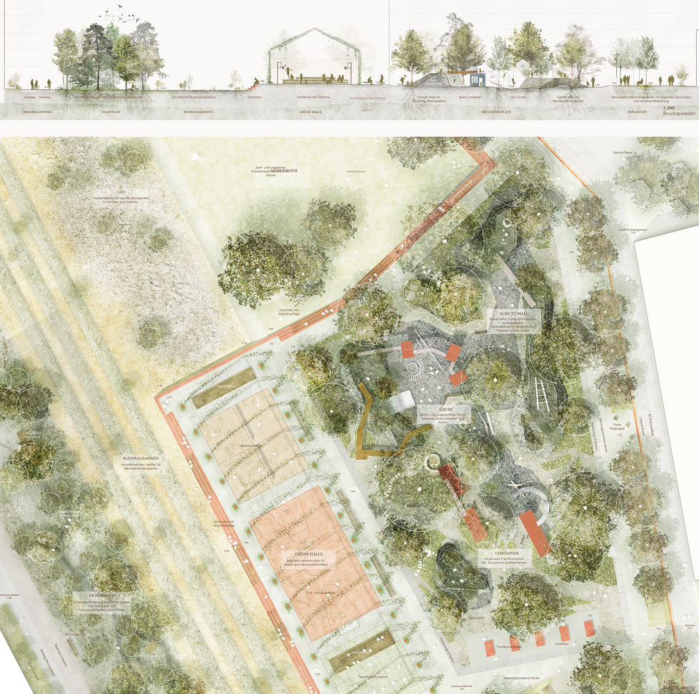 Mit der Umgestaltung des ehemaligen Bahnhofsareals entsteht im dicht bebauten Stadtgefüge die Grüne Mitte als zentraler, durchlässiger Freiraum. Das Projekt „Neue Horizonte“ vernetzt das Quartier mit seiner Umgebung, verbindet historische Identität mit neuer Stadtqualität und schafft einen ökologischen, sozialen und klimaresilienten Parkraum. Der Park umfasst eine abwechslungsreiche Hainkulisse im Westen, eine offene Mitte mit artenreichen Wiesen und Weitblick sowie die Esplanade im Osten als urbanes Rückgrat mit Flaniermeile, Plätzen und Begegnungsangeboten. Ergänzt wird das Konzept durch begrünte Straßenräume, eine südliche Grüne Spange mit Biotopgewässer, gemeinschaftliche Nutzungen wie Gärten, Sportflächen und Marktplätze sowie ein blau-grünes Band für Regenwassermanagement, Kühlung und Biodiversität.